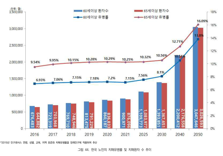 중앙치매센터,「2016년 전국 치매역학조사」결과 발표에 의하면, 2018년 기준 우리나라 65세 이상 노인 치매유병률 10.2%(75만 명)로 조사되었으며 2025년에는 100 만 명, 2050년에 는 300 만 명을 넘게 될 것으로 예상된다. 대한민국 65세 이상 노인 10명 중에 1명은 치매에 걸리는 셈이다.